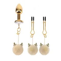 Dulceața și senzualitatea pot merge mână în mână – iar acest set adorabil este cea mai bună dovadă. Acoperitoarea anală aurie cu un cristalin strălucitor și o pereche de pompoane moi este propunerea ideală pentru cei care apreciază atât estetica, cât și senzațiile condimentate. Completați de clemele pentru sfârcuri cu aceleași pompoane, care stimulează subtil fiecare mișcare a ta... și fiecare atingere.