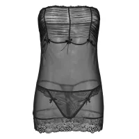 Partea de sus a lenjeriei nu are bretele, ceea ce invită și mai mult la jocuri intime, iar datorită drapajelor de pe bust adaugă o notă de mister incitant. Partea de jos este decorată cu dantelă cu model floral, oferindu-ți o eleganță rafinată.
