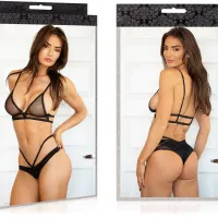 Un set sexy de lenjerie erotică senzuală pentru femei. Setul constă dintr-un sutien și tanga din plasă delicată și curele decorative, elastice. Sutienul are bretele reglabile și cupe triunghiulare, expunând frumos bustul. Lenjeria este perfectă atât pentru purtarea de zi cu zi, cât și pentru o întâlnire erotică.