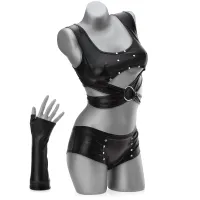 Set erotic de lenjerie damă din material care oferă efect de piele udă. Top senzual, cu legături, șorturi decupate și mănuși seducătoare. Setul se va prezenta minunat cu pantofi pe platformă înaltă, iar întregul va fi completat perfect de un bici și o mască pentru ochi - o ținută pentru femeia vamp dominantă și încrezătoare. Topul are un design la modă, cu legături fanteziste, care evidențiază senzual talia, iar materialul moale lasă discret la vedere sânii, crescând dorința. Șorturile sunt croite astfel încât să scoată în evidență fesele, oferind spațiu pentru palme apăsate. Mănușile incluse în set adaugă eleganță și rafinament întregului, iar cu puțină imaginație le poți folosi pentru preludiu sau petting.