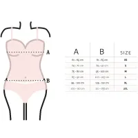 Partea de sus a lenjeriei nu are bretele, ceea ce invită și mai mult la jocuri intime, iar datorită drapajelor de pe bust adaugă o notă de mister incitant. Partea de jos este decorată cu dantelă cu model floral, oferindu-ți o eleganță rafinată.