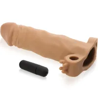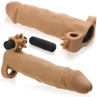 Extinde pănă la 5 cm! Manșon unic pentru penis, conține un motoraș de vibrare suplimentar, pe care-l poți plasa în manșonul cu file de masaj. Va garanta amantei Tale senzații cerești. Când vei mângâia vaginul ei cun penis mai mare și mai gros, manșonul va aveasgrijă de clitorisul ei setos. Extinderea realizată din ciber piele este esxtrem de neteă și plăcută la atingere. În plus, va asigura astfel imresii realiste, care sunt împuternicite, de semenea, cu filele și venele naturale. Manșonul conține ți inelul, pe care-l poți plasa pe testicule și, astfel Te poți bucura de senzații de nedescris, precum și de un act îndelungat. Află calitatea nouă a sexului, oferă-i partenerei Tale ceea la ce a visat întotdeauna și alege manșonul multifuncțional excepțional.