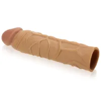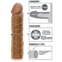SPECIFICAȚII: - Material: Ciber piele - Culoare: Maro - Extinderea penisului: 3 cm - Lungimea manșonului fără extindere (posibilitatea de reducere a lungimii): 17,5 cm - Lungimea spațiului gol: 14,5 cm - Diametrul exterior al manșonului: 3,5 cm - Diametrul interior fără extindere: 3 cm - Îngroșarea penisului: 0,5 cm - Extindere: până la 200% - Rezistent la apă: Da